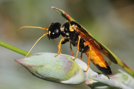 Aussehen Die ausgewachsenen Tiere besitzen einen schwarz gefärbten Kopf und Thorax mit gelben Markierungen, während das Abdomen überwiegend gelb bis rotgelb ist mit schwarzen Absetzungen an der Basis und Spitze. Die Flügel sind gelblich gefärbt und die Beine zeigen gelbe Tibien und Tarsen, die Oberschenkel jedoch meist dunkler.