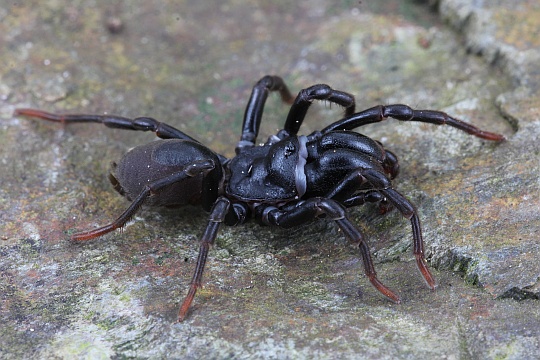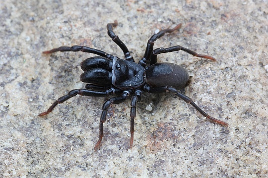 Aussehen Die Männchen sind meist tiefschwarz gefärbt, die Weibchen dunkelbraun bis schwarz. Sie besitzen mächtige, nach vorne gerichtete Kieferklauen (Cheliceren) mit orthognather Stellung, was sie als «vogelspinnenartig« kennzeichnet. Jungtiere sind oft auffallend heller gefärbt.