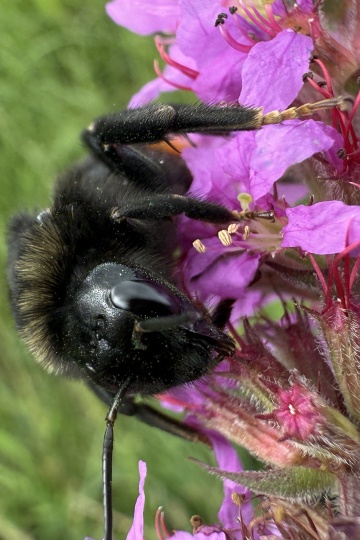 Aussehen Die Felsen-Kuckuckshummel besitzt einen überwiegend schwarz gefärbten Körper, dessen Hinterleibsende leuchtend rot gefärbt ist. Ihre Flügel sind dunkel getönt, und bei manchen Tieren zeigt sich eine schmale gelbe Querbinde hinter dem Kopf. Der Kopf ist eher rundlich geformt und trägt einen kurzen Rüssel. Typische Pollensammelvorrichtungen an den Hinterbeinen fehlen, da sie als Brutparasit keinen eigenen Pollen sammelt.