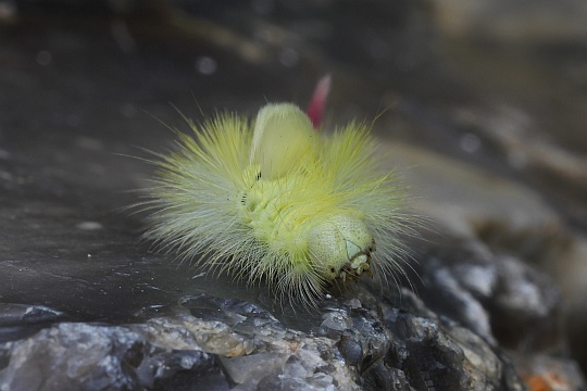 Raupe Die Raupen können gelbgrün, manchmal rosa oder rotbraun sein. Sie besitzen eine lange dichte Behaarung und rasierpinselartige Haarbüschel am Rücken.