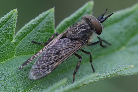 Diese zu den kleinsten Vertretern der Familie gehörende Bremse besitzt eine schwarzgraue Grundfarbe und ist auf dem Körper zart olivgrau bestäubt. An den Seiten des Hinterleibs trägt sie hellgraue rundliche Flecken. An den großen Facettenaugen kann das Geschlecht bestimmt werden. Bei den Weibchen tragen sie metallisch gefärbte zickzackförmige Querstreifen, sind deutlich durch eine breite hellgraue Stirn voneinander getrennt und tragen zwei samtig schwarze Flecken. Die Augen der kleineren und dunkleren Männchen stoßen an den Innenseiten direkt aneinander.