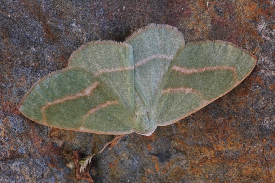 Aussehen Der Zweibindige Nadelwald-Spanner zeigt zwei Farbvarianten: eine rostrote Form (forma fasciaria) und eine grüne Form (forma prasinaria). Beide Varianten besitzen auf den Vorderflügeln zwei leicht gebogene, dünne Querbinden, wobei das mittlere Feld oft dunkler gefärbt ist. Die Hinterflügel sind heller und tragen eine schwache Querlinie. Die Fühler der Männchen sind gefiedert, während die der Weibchen fadenförmig sind. Die grüne Form bietet eine hervorragende Tarnung in Nadelwäldern, während die rostrote Variante auf Kiefernästen weniger auffällt. In der Ruhehaltung liegen die Flügel dachförmig über dem Körper und lassen die Tarnfärbung besonders gut zur Geltung kommen.