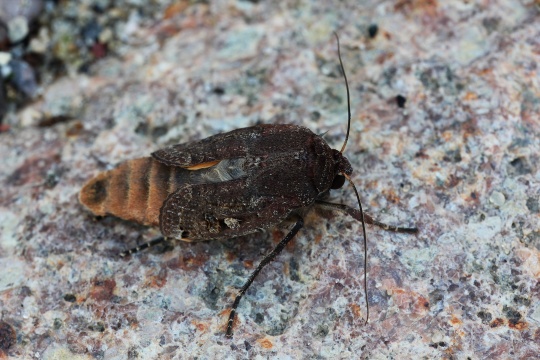 Lebensweise Die Weibchen legen ihre Eier in mehrschichtigen Gelegen auf Kräutern ab. Sie schließen ihre Entwicklung in wärmeren Gebieten noch im Sommer ab und bringen so eine 2. Faltergeneration hervor. Die Raupen sind kahl, dunkelgelb bis grünlich und verbergen sich tagsüber. Der erwachsenen Falter verbirgt sich tagsüber mit schmal über dem Hinterleib zusammengefalteten Flügeln in verschiedenen Schlupfwinkeln. Werden sie gestört flattern sie auf und zeigen dabei das gelb der Hinterflügel.