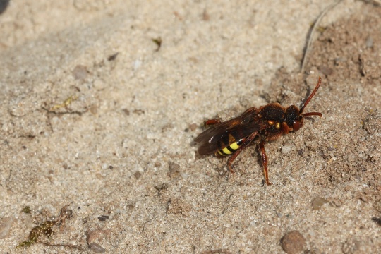Lebensweise Alle Wespenbienen parasitieren in Sandbienenarten, was ihnen die Bezeichnung Kuckucksbienen eingebracht hat. Nach der Eiablage des Wirtes legt die Wespenbiene ihr Ei im Wirtsnest ab. Die schlüpfende Larve ernährt sich in der Brutkammer vom Ei oder der schon geschlüpften Wirtslarve. Die Flugzeit erstreckt sich von April bis Juni, seltener schon ab März. Abhängig von der Wirtsart kann der Entwicklungszyklus 2-mal in einem Jahr durchlaufen werden, andernfalls überwintert die Larve im Nest.