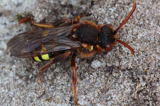 Lebensraum Die Rothaarige Wespenbiene kommt in trockenen Habitaten wie Sandgebieten, Kiesgruben und vegetationsarmen offenen Stellen vor. Die Tiere sind in der Nähe der Nester ihrer Wirtsbienen wie Andrena vaga, A. cineraria und A. barbarea anzutreffen.