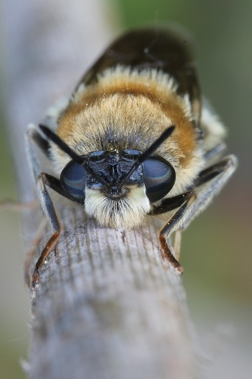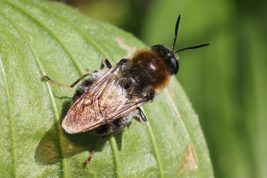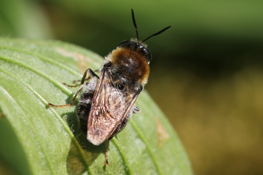 Aussehen Die langen schwarzen Antennen der Langhorn-Waffenfliege sind im oberen Bereich in 4 Segment geteilt. Sie besitzt außerdem zwei weiße Punkte am Hinterkopf. Diese von den 50 in Mitteleuropa lebenden Arten ist ferner durch ein kleines sechseckiges Feld auf den Flügeln in der Nähe der vorderen Kante gekennzeichnet. Der abgeflachte sehr breite Hinterleib ragt über die in Ruhe auf dem Hinterleib gefalteten Flügel seitlich hinaus. Die Erscheinungsform ist sehr bienenähnlich.
