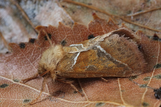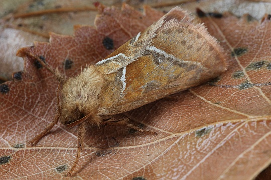 Aussehen Der an Beine und Brust dicht behaarte Falter ist durch recht schmale Flügel gekennzeichnet. Die im Gegensatz zum Weibchen oft deutlich kleineren Männchen haben rötlichbraune Vorderflügel, die eine weißlich umrandete braune Binde aufweisen. Die Flügelfärbung der Weibchen ist graubraun, auf den Vorderflügeln ist eine schmale weiße Linienzeichnung sichtbar. Diese Unterschiedliche Erscheinungsform der Geschlechter wird auch als Geschlechtsdimorphismus> bezeichnet.