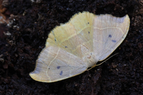 Aussehen Charakteristisch sind die beiden dunklen Zwillingspunkte auf den Vorderflügeln. Seltener kommen sie auch schwächer ausgeprägt auf den Hinterflügeln vor. Auf den gelbbraunen Vorderflügeln sind ferner zwei helle Querlinien sowie eine sichelförmig grauschwarze Zeichnung in der gebogenen Flügelspitze erkennbar. Die Vorderflügel der Weibchen sind etwas heller (hellgelb). Es werden pro Jahr 2 Generationen ausgebildet. Exemplare der zweiten Generation sind kleiner und heller gefärbt.