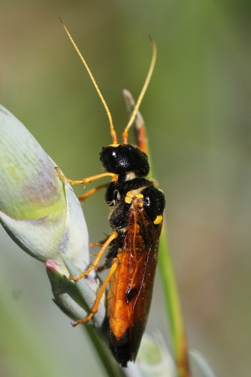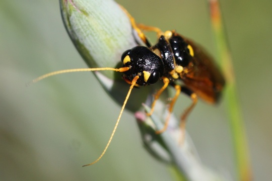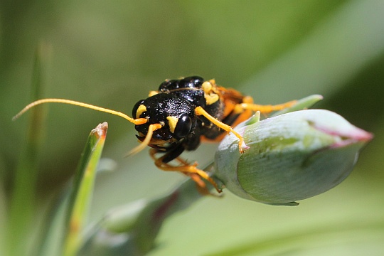 Aussehen Die ausgewachsenen Tiere besitzen einen schwarz gefärbten Kopf und Thorax mit gelben Markierungen, während das Abdomen überwiegend gelb bis rotgelb ist mit schwarzen Absetzungen an der Basis und Spitze. Die Flügel sind gelblich gefärbt und die Beine zeigen gelbe Tibien und Tarsen, die Oberschenkel jedoch meist dunkler.