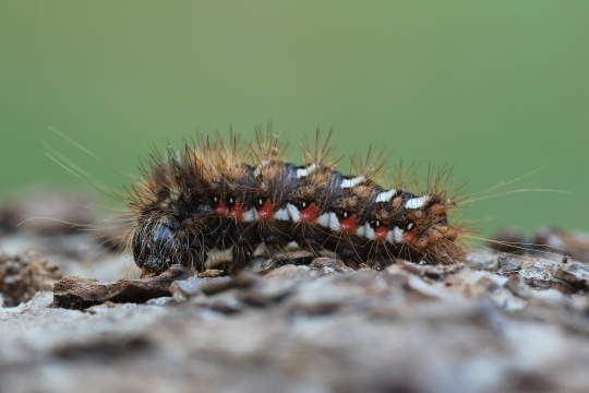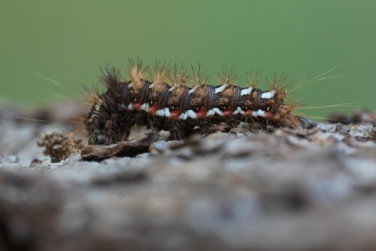 Raupe Die erwachsenen rot- oder graubraunen Raupen haben am ganzen Körper lange Borstenbüschel. Auf dem Rücken verläuft eine Reihe roter Punkte, die jeweils von weißen Flecken flankiert sind. An den Seiten ist eine grellweiße Längslinie charakteristisch, die von roten Punkten unterbrochen wird.