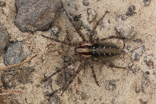 Aussehen Die Labyrinthspinne ist hellbraun gefärbt und trägt auf Vorder- und Hinterkörper 2 dunkle Längsbinden. Der Hinterkörper ist weiterhin durch helle Schrägstriche gekennzeichnet. Sie ist langbeinig und schlank und besitzt auffallend lange Spinnwarzen.