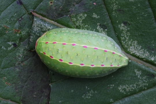 Sonstiges Die Raupen sind durch ihre schneckenartige Fortbewegung leicht erkennbar und heben sich dadurch deutlich von anderen Schmetterlingsraupen ab. Sie haften mit einer Schleimschicht an Blättern und meiden behaarte Oberflächen. Die Art gilt in Deutschland als ungefährdet und zeigt stabile Bestände, solange geeignete Waldstandorte erhalten bleiben.