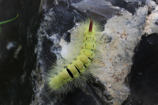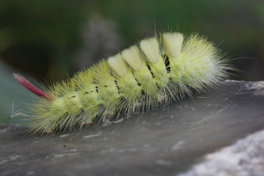 Raupe Die Raupen können gelbgrün, manchmal rosa oder rotbraun sein. Sie besitzen eine lange dichte Behaarung und rasierpinselartige Haarbüschel am Rücken.