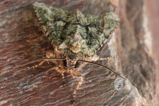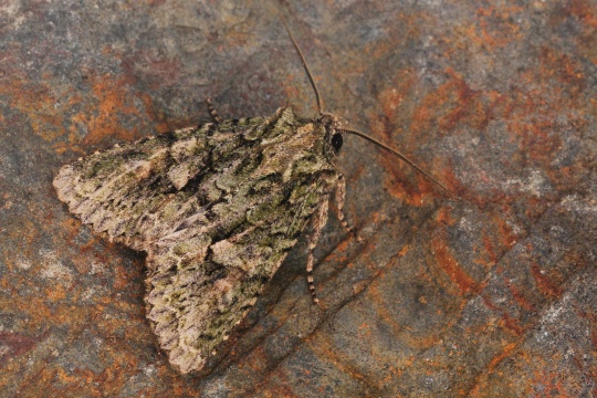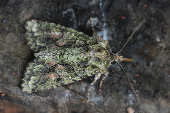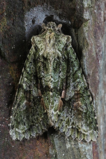 Aussehen Die Olivgrüne Eicheneule besitzt moosgrüne Vorderflügel mit undeutlich schwärzlichen Linien durchmischt mit schwach rötlichen Farbtönen.