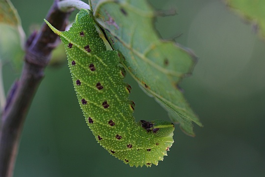 Raupe Die gelblich- oder blaugrünen Raupen tragen kleine weiße Punktn und besitzen am Hinterleibsende ein gelbes Horn. An den Seiten sind jeweils zwei Reihen rötlicher Punkte sichtbar.