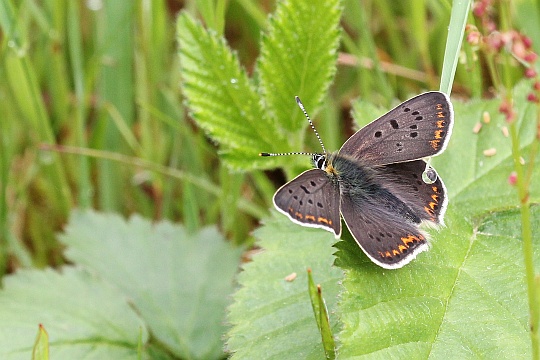 Aussehen Die Männchen des Braunen Feuerfalters haben eine dunkelbraune mit kleinen schwarzen Flecken besetzte Flügeloberseite und undeutliche orange Flecken am Saum. Das Weibchen hat fast vollständig orange Vorderflügel. Die Unterseite der Flügel ist hellgräulich mit kleinen schwarzen Flecken. Die hellgrüne Raupe des Braunen Feuerfalters besitzt weiße Flecken.