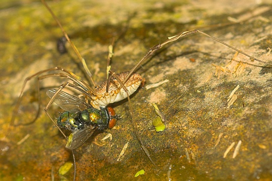 Lebensweise Die Weibchen legen ihre Eier in feuchtes Erdreich ab. Dabei werden die kugelrunden Eier mit Hilfe einer langen Legeröhre versenkt (bei Beobachtungen werden für einzelne Ablagen Zahlen um 80–100 Eier genannt). Die Überwinterung erfolgt als Ei oder als frisch geschlüpftes Jungtier. Die Tiere sind überwiegend nachtaktiv, zeigen in Ruhestellung eng anliegende, oft ineinander verschlungene Beine und betreiben sowohl Such- als auch Tastverhalten.