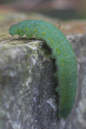 Raupe Junge Raupen des Karstweißlings sind ockerbraun bis grünlich-braun und haben einen schwarzen Kopf. Später werden Kopf und Körper grün. Bei älteren Raupen, die kurz und fein behaart sind, verläuft ein gelber Längsstreifen entlang der Körperoberseite, begleitet von je einem gelben Längsstreifen an den Flanken. Der Körper ist mit zahlreichen feinen schwarzen Punkten bedeckt.