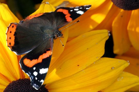 Lebensweise Der Admiral ist oft auf Sommerflieder oder Wasserdost zu beobachten, im Herbst sieht man ihn auch auf heruntergefallenem, gärendem Obst. Zwischen Frühjahr und Herbst bilden sich bis zu 2 Generationen aus. Das Weibchen legt nur ein Ei auf die Futterpflanze ab. Aus den Blättern der Brennnessel baut die Raupe Hüllen für die Verpuppung. Die Raupe frisst ca. einen Monat, sie ist schwarz mit weißen Punkten.