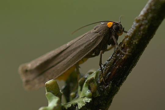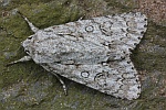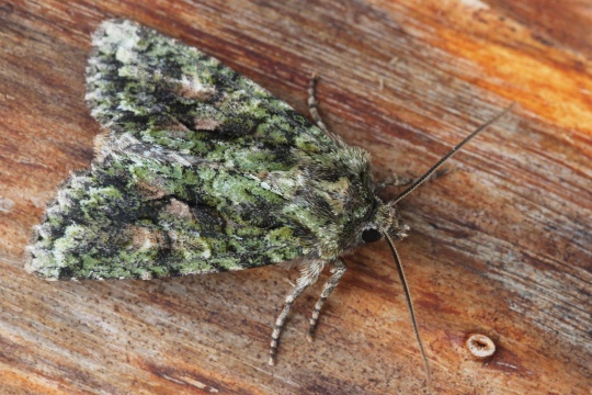 Das Faltermuster zeigt graubraunen Grund mit gelblichen Querlinien und dunklen Punkten sowie sichelförmige Vorderflügelspitzen. Die Art lebt bevorzugt in lichtreichen Nadel- und Mischwäldern sowie Parks mit Flechtenbewuchs. Die Raupen ernähren sich ausschließlich von Baumflechten auf verschiedenen Gehölzen.