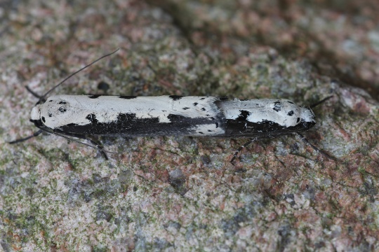 Die Vorderflügel der Natternkopf-Grasminiermotte sind schwarz-weiß. Kennzeichnend sind auch drei schwarze Punkte, die auf der Oberseite an beiden Seiten des Bruststückes zu sehen sind. Bevorzugt werden Habitate mit sandigen Böden wie Magerrasen, Dünen, Ruderalflächen oder ähnliches. Ruhende Falter rollen die Flügel eng an den Körper.